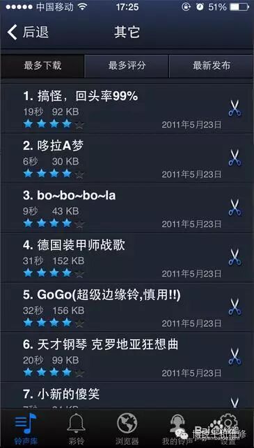 3、比如我在“其他”分类里选择第一个搞怪的铃声,点击这个铃声就可以试听。如果选中这个铃声,就点击右边的那个小剪刀。
