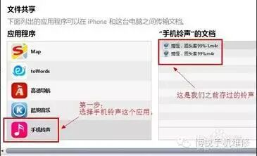 4、在应用程序里面找到文件共享(在下面),选择“手机铃声”这个应用,后面就会显示刚才我们存过的铃声。