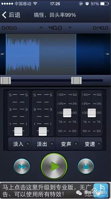 4、然后进入编辑页面,你可以对一段铃声进行编辑,可以淡入、淡出、变声、变速,还可以剪切铃声。按绿放按钮即可播放铃声,如果编辑结束就点击右侧存储按钮。