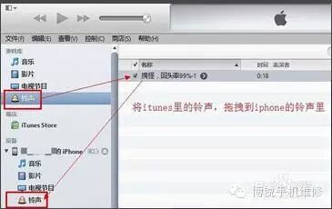 8、然后需要把存在itunes里的铃声再拖拽到本人的iPhone里就大功告成了。看起来有点麻烦,但是操作起来其实很简单。就是一个将应用里的文件→电脑→itunes→iphone的过程,然后试试你的新铃声吧。