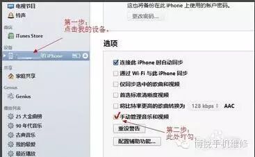 2、然后选择你的设备,下拉到下面的选项。在选项里有一栏“手动管理音乐和视频”,在这项前面打勾。