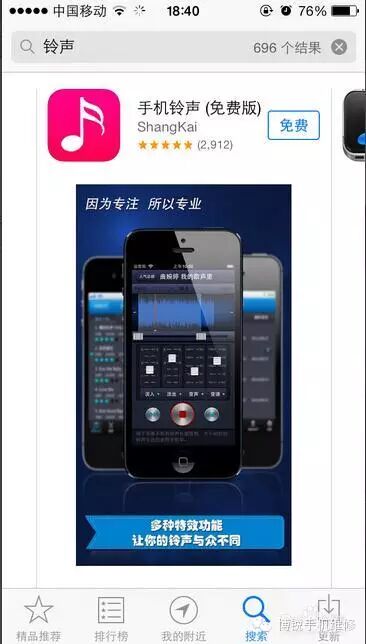 1、首先我们先去App Store里面找到一个“手机铃声”的软件,这个软件有免费版和专业版(收费)的区别,小鸡觉得没有必要花钱去弄个铃声,所以下载一个免费版即可。