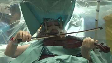 手术开始后,娜奥米被要求全程保持清醒,并且一直演奏小提琴。原来,医生需要将带有电极的脑起搏器植入大脑,使设备发出的神经脉冲能压制娜奥米双手的震颤症状。娜奥米在手术过程中一直演奏小提琴,是为了测试起搏器的位置是否放置精准。