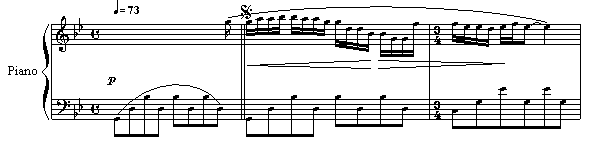 请大家仔细观察谱例三的左手部分,然后与谱例一对照,其实左手部分的和弦就是以Ⅰ、Ⅳ、Ⅴ这三个和弦为主,只是在和弦的原位和转位做变动。谱例三到第一个反复记号为止,它们的和声进行是(一个和弦对应一个级数)Ⅰ--Ⅳ--Ⅰ--Ⅰ--Ⅰ-- Ⅴ--Ⅰ--Ⅳ--Ⅰ--Ⅰ--Ⅴ--Ⅰ。其中Ⅴ级在实际运用时,通常会用它的七和弦,然后再省略五音。