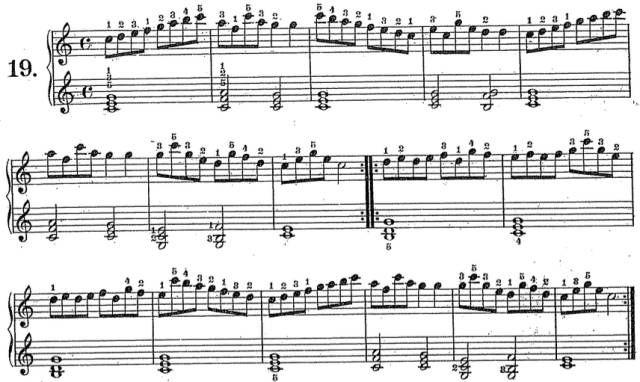 几乎所有歌曲的和弦编配都是以 Ⅰ、Ⅳ、Ⅴ这三个和弦为主,它们相当于歌曲的脊柱,了解Ⅰ、Ⅳ、Ⅴ的进行规律,自己就可以对一些简单歌曲进行编配。下面以车尔尼599第19条为例,简单讲解基本的和声进行。
