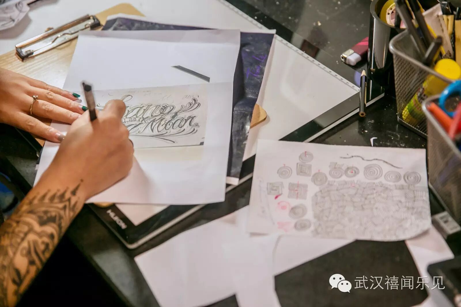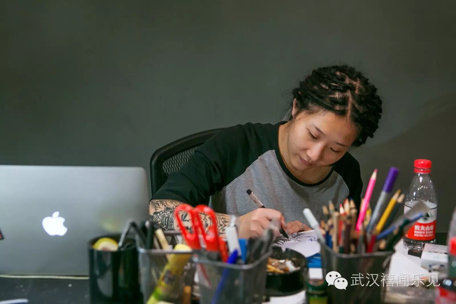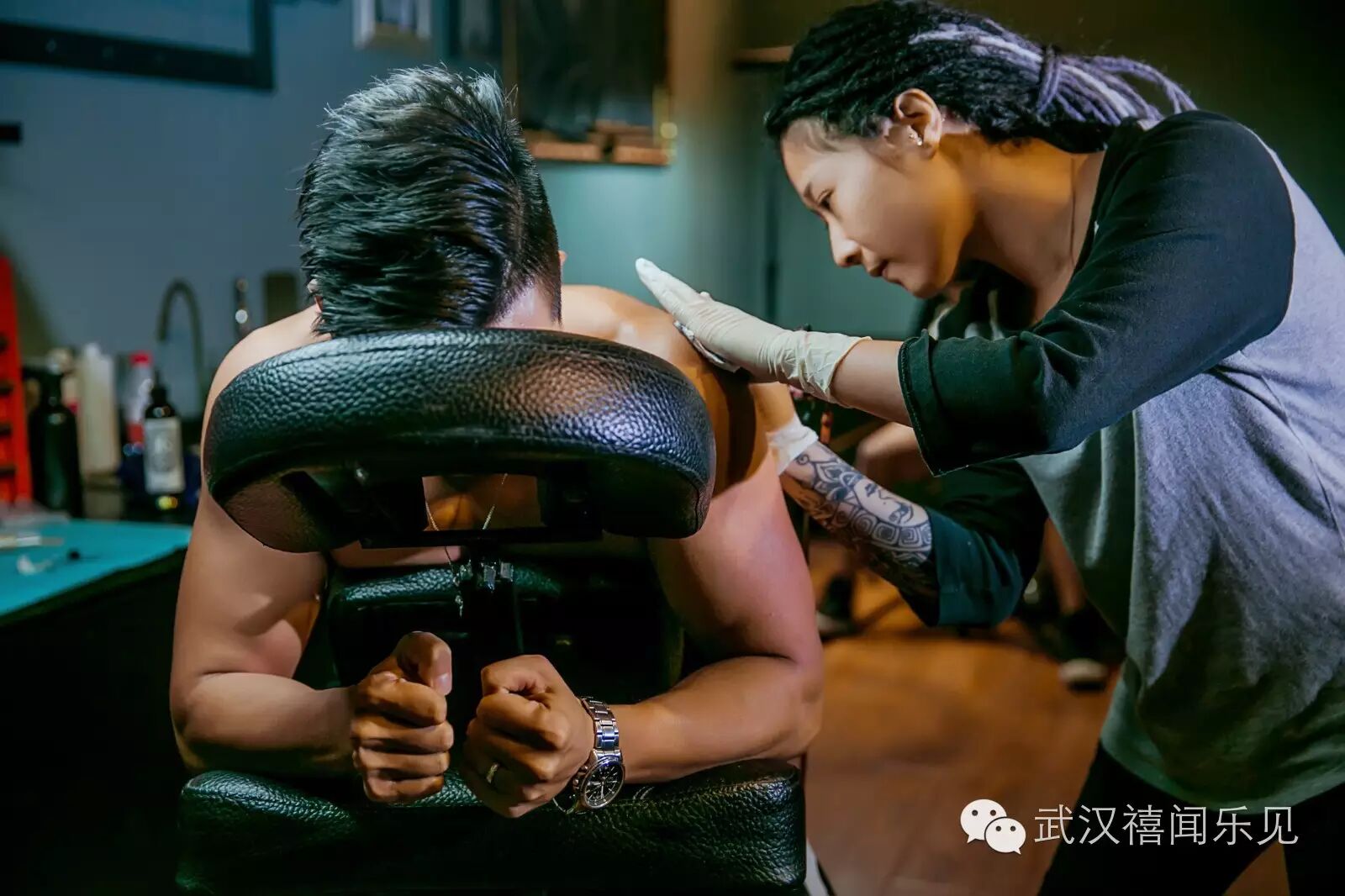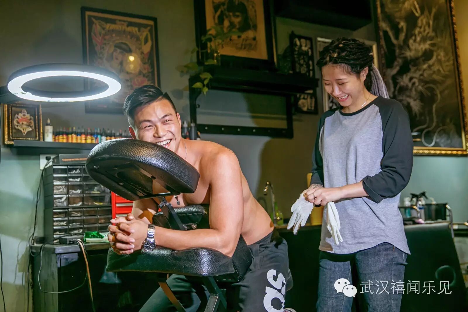 以前做教辅平面设计的她,去过北京回武汉选择了做纹身师。她老公的阿丹刺青在宝丽金,这里是六月份才开的,区别于那边的是,泰兴里十号偏向于年轻、潮、原创。