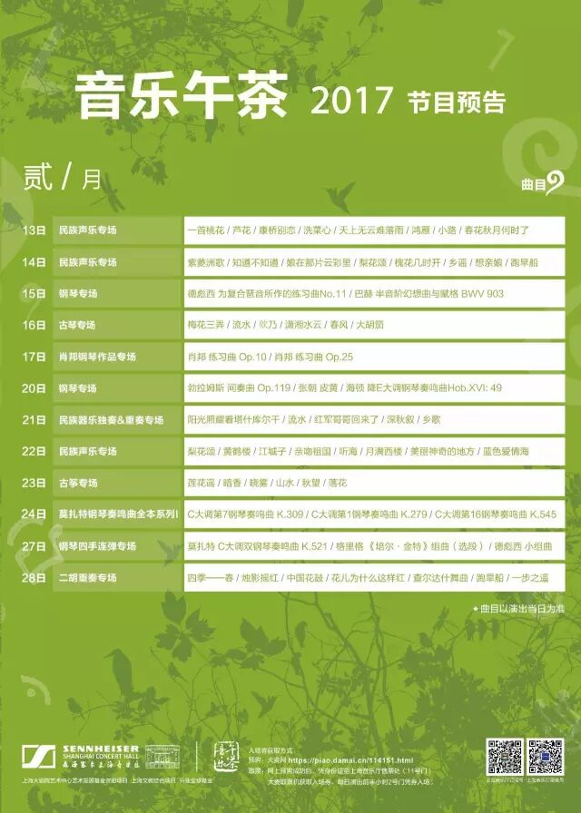 春节后,年味“茶”香奉上:2月13、14、22日中国古诗词艺术歌曲、民歌、民族歌剧选段一个都不能少;16日聆听古琴的士人雅音;17日畅游肖邦的键盘世界;21、23、28日民族器乐演绎浓浓中国情;24日2017年全本系列首发,带您走进天才莫扎特的音乐世界。具体开票时间请关注大麦网!