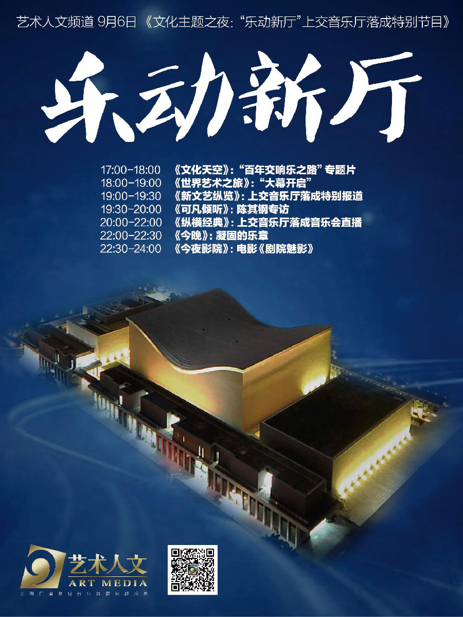 上海交响乐团历史上第一个“团厅合一”的年度音乐季即将于9月6日正式启动。在这个乐迷关注、等待的特别之日,上海广播电视台公益媒体群成员艺术人文频道也精心烹制了一桌“艺术大餐”,当日17:00-24:00艺术人文频道将推出《文化主题之夜:“乐动新厅”上交音乐厅落成特别节目》,以资讯报道、专题片、纪录片、名家访谈等多种节目样式从多角度呈现“音乐厅的故事”,呈现建筑与音乐的互动性,带领大众一起走近经典。