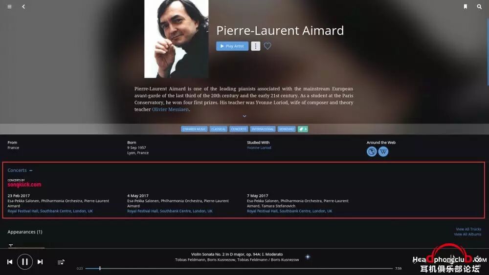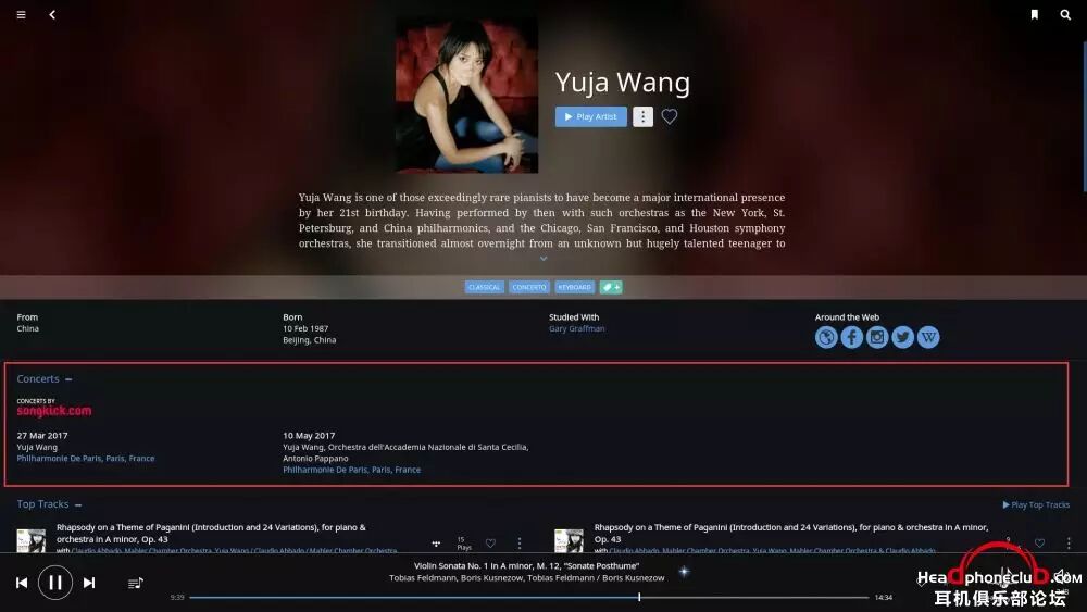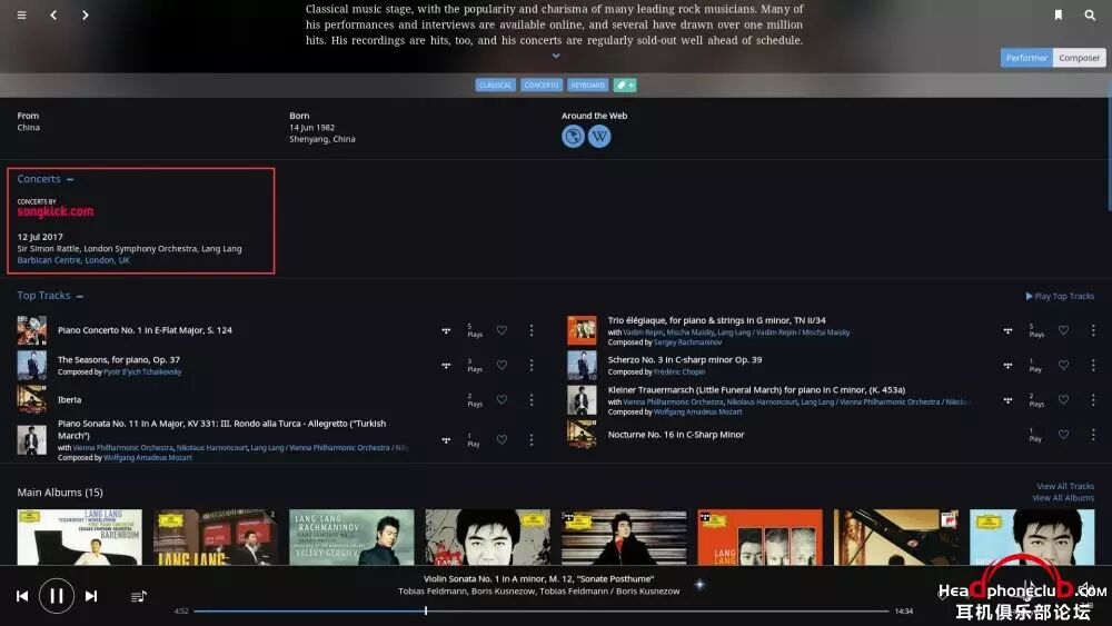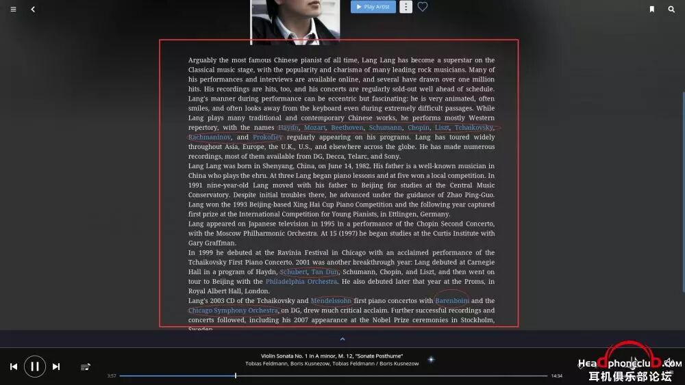 郎朗艺术生涯的介绍,注意,Roon 中任何的蓝色字体都可点击,进行进一步拓展
