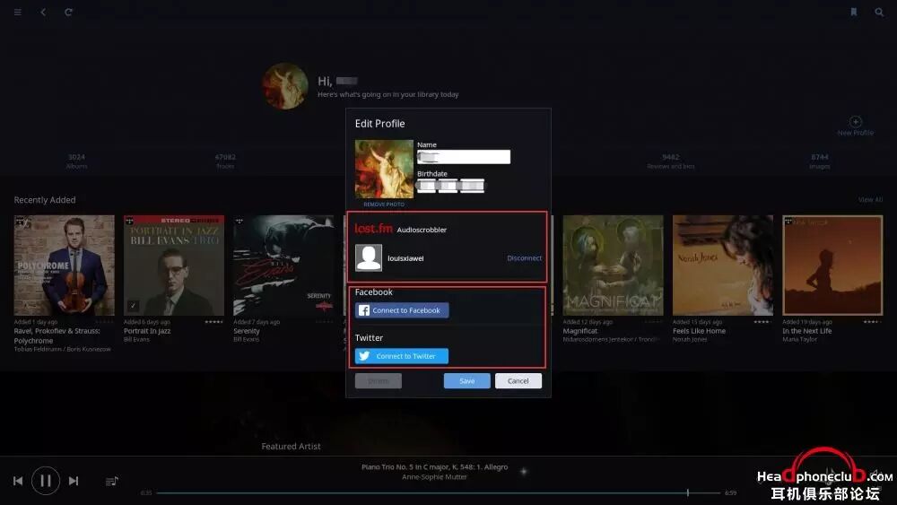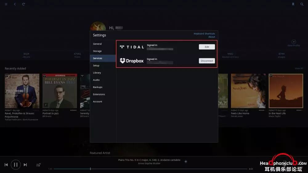 先介绍一下Roon 可以绑定的服务:last.fm (用于last.fm 的数据库关联), facebook, twitter (用于社交分享), Tidal (无损母带云端数字流), Dropbox (用于网盘云端备份数据库)