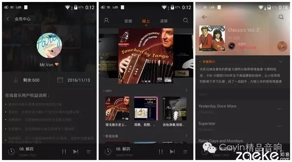 每一位Cayin i5的使用者,均能够得到三个月的免费VIP会员权限,并可在线试听44.1/16标准的flac无损音乐,并进行下载保存。这样的做法能够在一定程度上,解决使用者的音源下载问题导致的体验问题。但更多的意义在于,推动与培养版权概念。