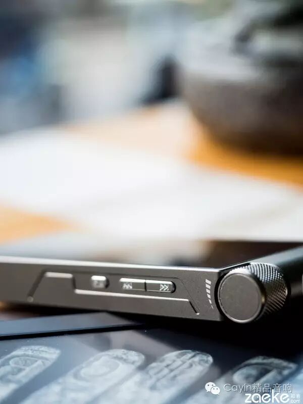 在细节方面值得细说的, 自然是Cayin i5的音量滚轮与接口设计。Cayin i5的音量滚轮设计在机身顶部位置,并且与半圆形的机身线条结合起来,是相当不错的设计灵感。音量滚轮那精致的表面纹路,提供着足够好的摩擦力与定位,配合顺畅而不失阻尼的手感,说得上是加分点。