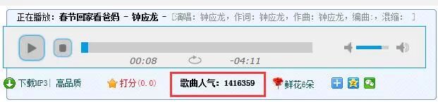 功夫不负有心人。钟应龙前两年初创作的歌曲《春节回家看爸妈》,最近在网络意外走红,在国内音乐推广门户网站——中华演出网的点击率破了100万。