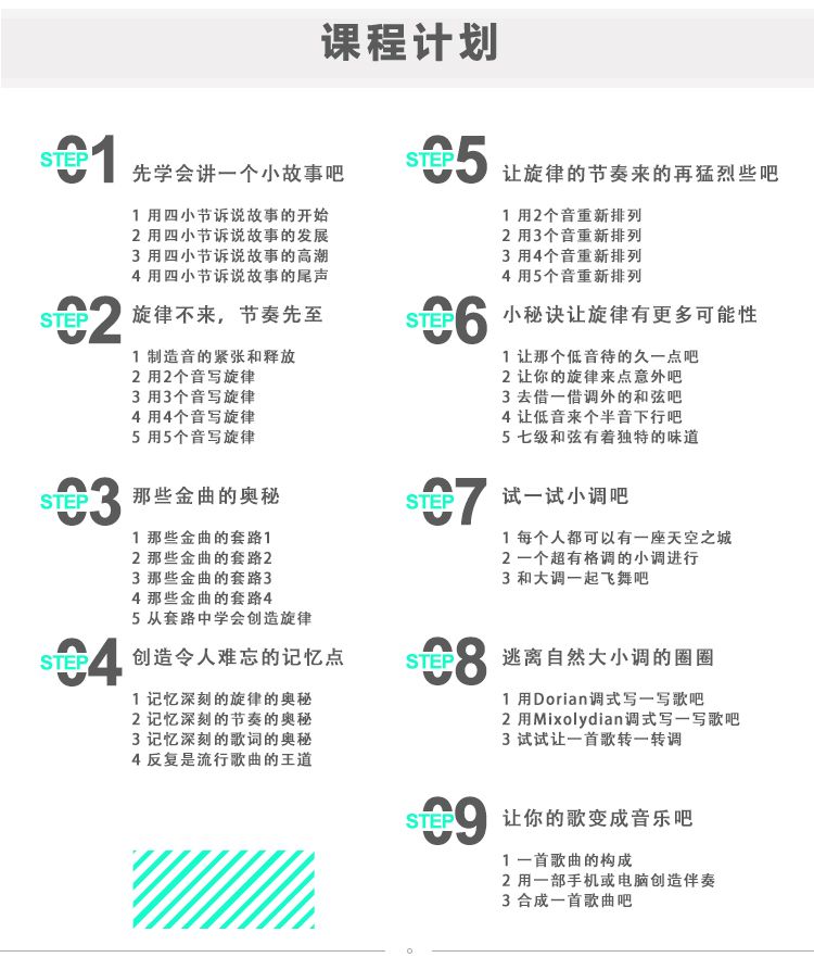 在这套课程中会包含:叙事思路介绍,节奏创作,记忆点创造,金曲套路分析,大小调及其他调式创作方法,简易歌曲制作等等干货,39课内容满满,让你打开歌曲创作的脑洞,告别‘瞎哼哼’式创作~