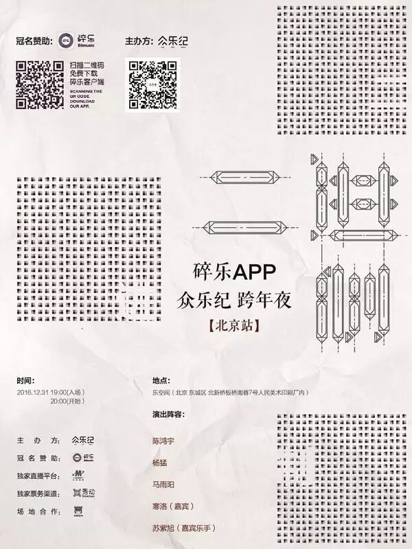 众乐纪每年都会做跨年的大聚会,把众乐纪的音乐人聚集到一起,和众友一起回顾一整年做的好玩有意义的事儿。现场不仅仅会有陈鸿宇、马雨阳、杨猛、苏紫旭等音乐人的演出,还会有很多好玩的环节。现场也会有两位新加入众乐纪音乐人队伍的音乐人首次和众友见面。