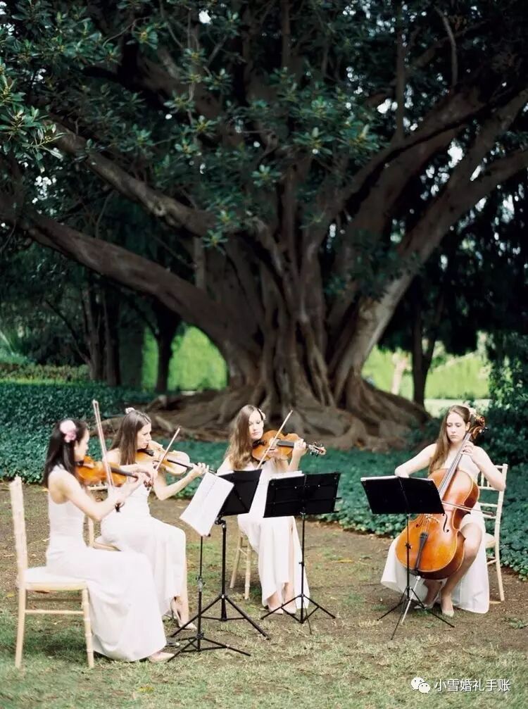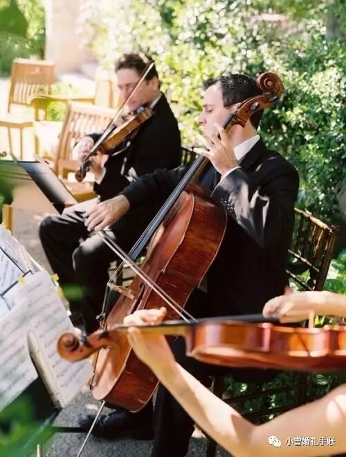 从暖场到仪式,到下午的cocktail,我们请了一个小提琴+大提琴+竖琴的乐队来演奏。晚宴和Party请了DJ控制现场灯光和音乐。我婚礼前期准备了很多音乐,最后指定演奏和播放的只有以下几首,其他的在前期和乐队/DJ交流了自己喜欢的风格以及明确不喜欢的风格,细节就交给了他们。