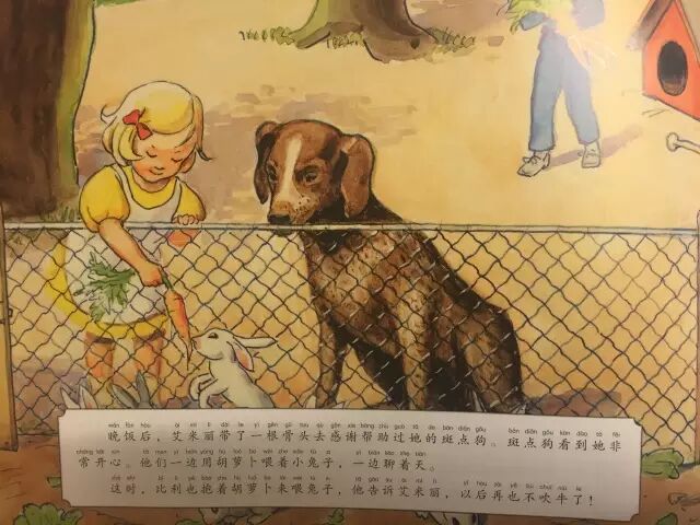 你看今天的故事里,小女孩艾米丽出发去牧场,帮妈妈看着奶牛黛西。路上她遇到斑点狗,邀她一起去找兔子玩儿,艾米丽去了吗?心无旁骛的艾米丽一心只想着帮妈妈去牧场看奶牛,没有去;后来又遇到比利,邀她一起去钓鱼,艾米丽去了吗?心无旁骛的艾米丽一心只想着帮妈妈去牧场看奶牛,还是没有去。后来,她果然完成了妈妈的任务,还把篱笆修好了,还和精灵一家交了朋友,对吗?所以呢,心无旁骛,是完成任务的很重要的方法。那,正在听故事的小朋友,如果你是艾米丽,路上遇到斑点狗和比利,你能拒绝他们的邀请,心无旁骛地专心完成任务吗?