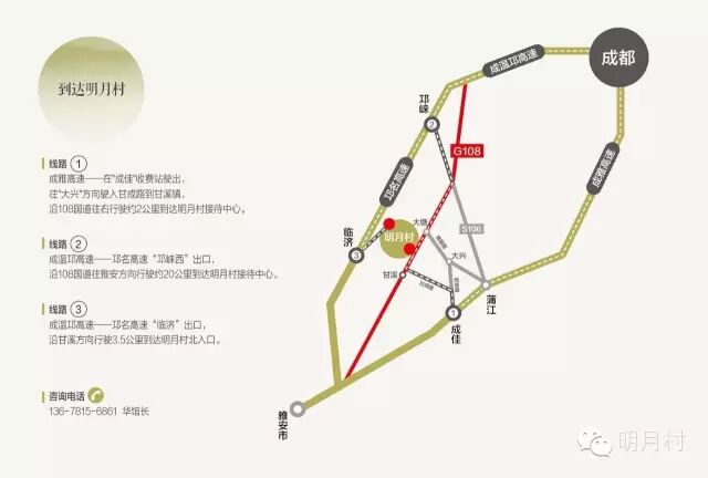 3、成温邛高速—成温邛高速“临济”出口,沿甘溪方向行驶3.5公里到达明月村。(但因临济出口至明月村路段整修,暂不通行,请选择其他路线!)