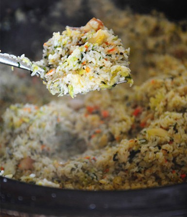 除了粽子,胖阿姨也烧农家菜饭:炒香的莴笋叶、卷心菜、胡萝卜丁,再加入咸肉和洗净的生米,用一个大铁锅直接放在灶头上焖熟。