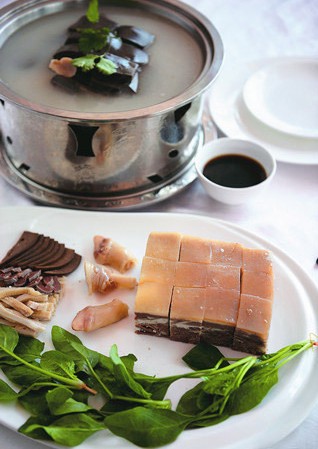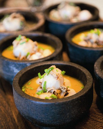 这道菜选用淀山湖河鳗,以天然枇杷蜜取代传统工艺中的冰糖,在烹饪的时候采用特别技巧,保持鱼皮不爆裂,最终成品浓油赤酱、色泽光亮、咸甜适口,肉质软糯有弹性。首创的鲍鱼猪脚,做法借鉴、结合了本地的红烧脚圈和广东人对鲍鱼的处理手法,做出了“私房”特色。