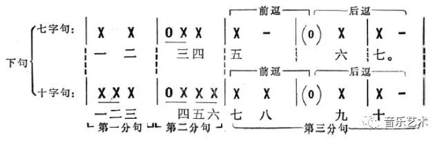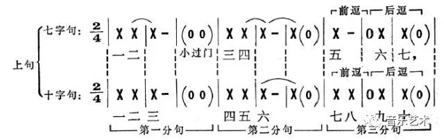 什么是二黄?简单的答案是:京剧音乐中所用的声腔之一。如果着眼于音乐的形态,可以说,二黄即一种较为固定的旋律模式。在刘吉典《京剧音乐概论》[3]中,作者用图表的形式解释了二黄腔的腔词句式关系,如下: