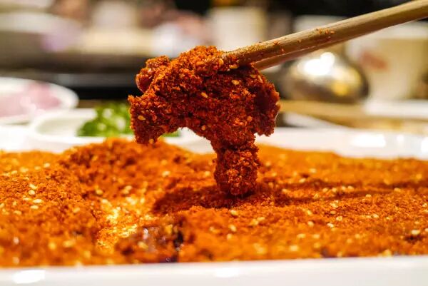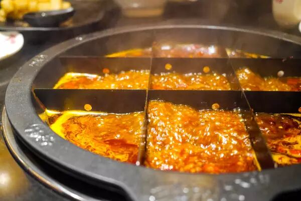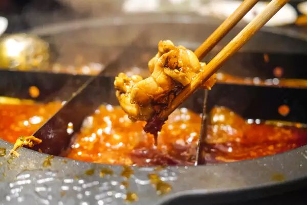 服务员将一次性包装好的牛油锅底倒入锅中,不一会儿就冒泡儿了,咕噜咕噜,一阵阵辣椒香及中药味扑鼻。原来,这锅底是由100多种配料反复炒制,并加入独家29味中药,这样的锅底才能麻辣有劲且回味悠长,还吃了不上火。四川的花椒和藤椒、重庆的朝天椒、郫县豆瓣与鲜牛油,重庆的大厨及锅具,光是一个锅底就足够“重庆味”了。
