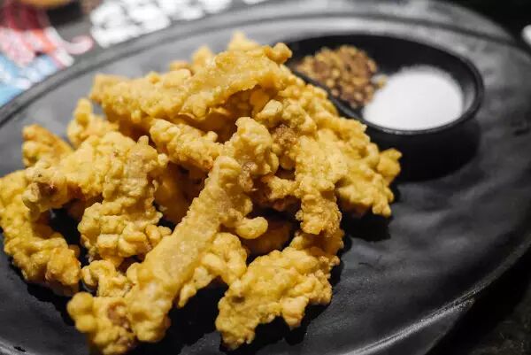 现炸酥肉哪能少?肥瘦参半的肉,裹上面粉在油中炸至金黄,沾取花椒粉和盐,香味适口,不干不柴,可涮吃也可以干吃。