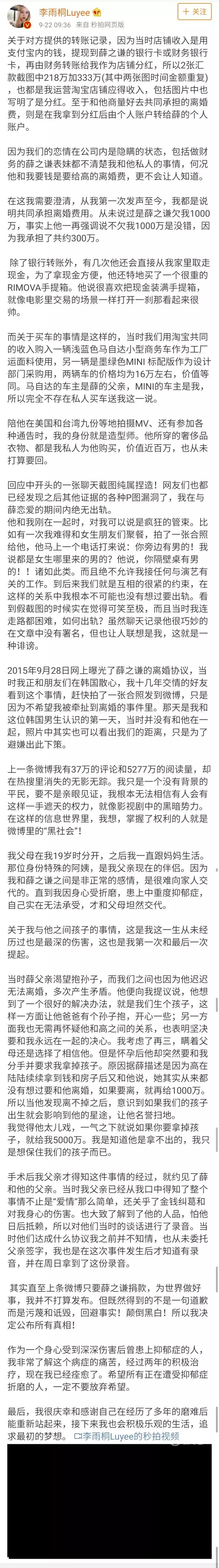 今天早上,李雨桐再次回应,讲述了她被薛之谦逼着堕胎的过程,晒出了给薛之谦转账流水,抑郁症诊断证明,还有李爸爸和薛之谦的对话录音。