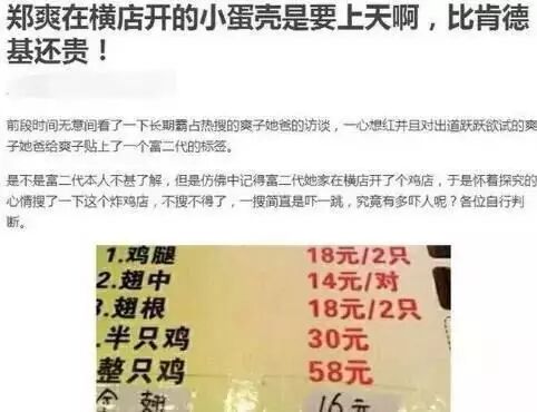 还有郑爽开在横店的炸鸡,也是圈内一梗。据说还有人因为太贵跑去砸店 ....