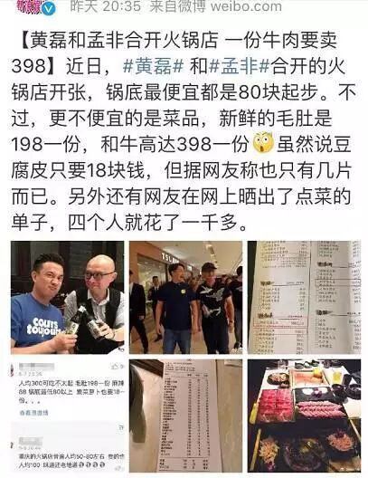 近日,黄磊黄小厨和孟非一起合开的火锅店开张。但一开门就不吉哇,被粉丝吐槽说价格太贵,一份牛肉398,四个人花一千多。