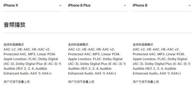 您要是细心找,关于音频的内容其实还是有的,只是相当隐蔽而已。打开苹果官网查看最新发布的这三款iPhone的详细对比参数, 拉到下方音频播放部分的对比位置,我们就能看到,在这三款产品支持的音频格式里,无损音频格式FLAC被添加了进来。这算是iOS11的一个更新内容,这三款新手机上市后肯定都是搭载最新的iOS11系统。