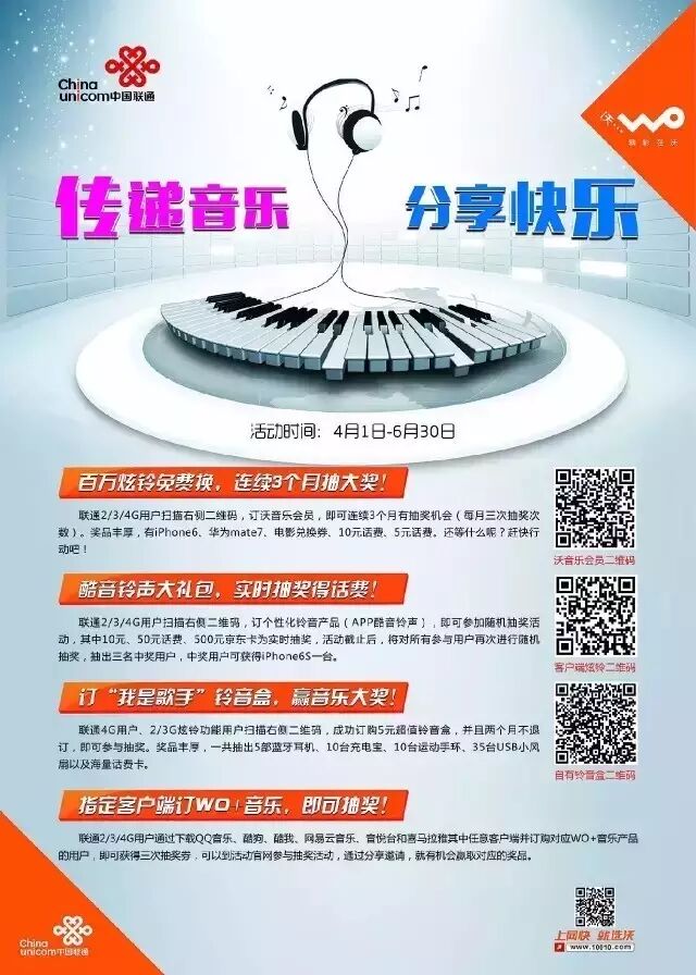 活动内容:通过下载QQ音乐、酷狗、酷我、网易云音乐、音悦台和喜马拉雅其中任意客户端并订购对应WO+音乐产品的用户,即可获得三次抽奖券,可以到活动官网参与抽奖活动,通过分享邀请,就有机会赢取对应的奖品。