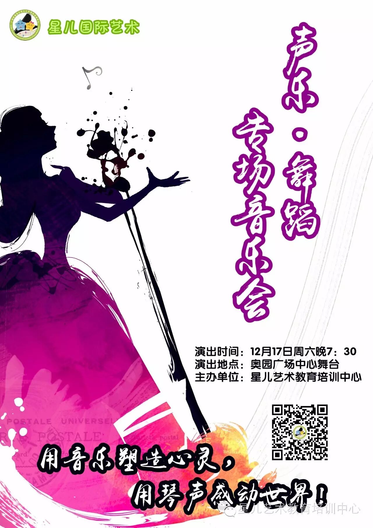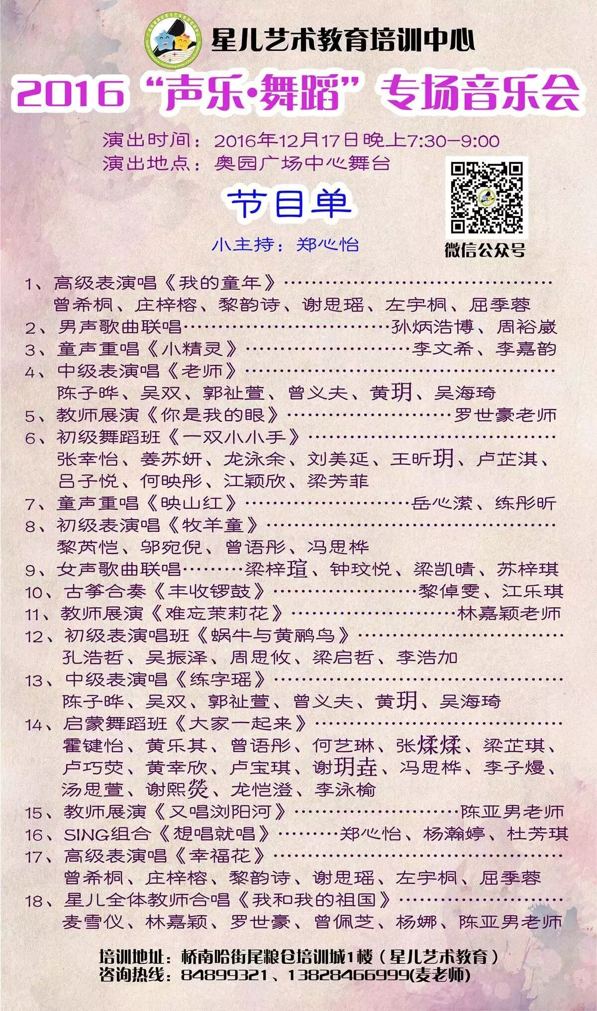 星儿艺术教育作为番禺区教育局民办学校,一直坚持以“业余学习,专业起步”的教学理念来规范学员学习的专业性!打造番禺专业音乐艺术教育机构品牌!本次音乐会将会由师生同台,不仅有优秀学员的展示,我们声乐教师也会展示优秀节目。相信我们将为大家带来一场专业精彩、值得学习观摩的音乐盛宴!
