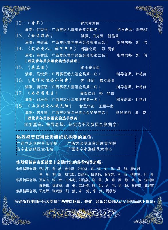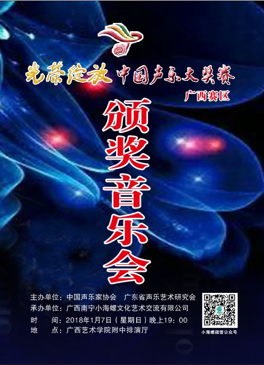 兹定于2018年1月7日晚19:00在广西艺术学院附中排演厅举办光荣绽放中国声乐大奖赛广西赛区颁奖音乐会。