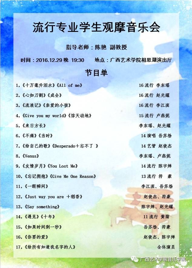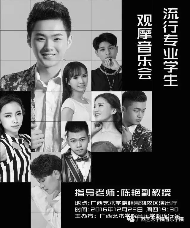 2016年12月29日(周四)19:30,音乐学生声乐系陈艳副教授流行专业学生观摩音乐会将在学校相思湖校区演出厅精彩上演,欢迎广大师生莅临指导!
