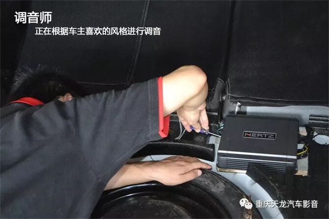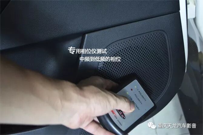功放安装环节,功放安装在后备箱地板框中安装完毕,使用专用的仪器调节相位