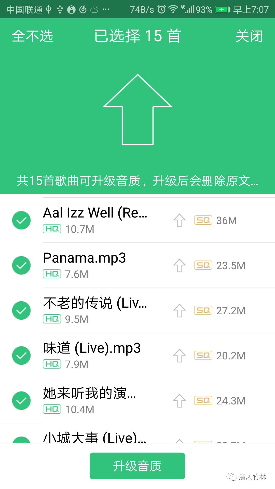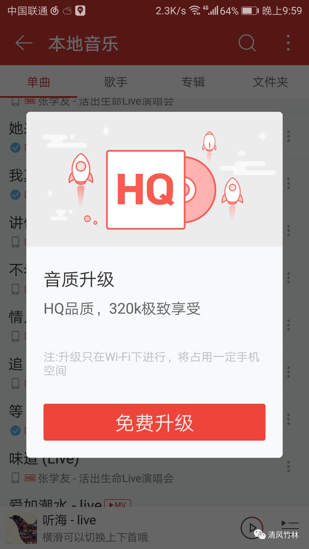 另外还有音质升级功能,自动识别音质比特率,如果发现较低码率音乐,跟云端比对后会提示是否升级,如果是会员可以直接升级到SQ(无损flac),普通用户也能升级到HQ模式。