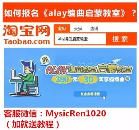 课程咨询微信:MysicRen1020QQ:1906422395【加即送,体验课程】淘宝页面:http://item.taobao.com/item.htm?id=17459508310(复制到浏览器打开)课程介绍Alay编曲启蒙教室适用:0基础,想通过电脑学习编曲、自学写歌的爱好者。简介:由《Alay编曲启蒙教室》原班教学团队全程跟进,2011年至今,专注全民编曲启蒙教学,具备丰富的教学经验,淘宝“编曲教程”品类口碑、人气第一名。承诺:让0基础且热爱音乐创作的你,30天掌握编曲!包含:《Alay编曲启蒙教室1.0》教程一套+《Alay编曲启蒙教室2.0抢先版》教程一份+200集选修教程+在线30天上课培训+1个月进阶课程培训+专属助教小课+内部软件音源+终身复修开课时间:每月1号课程内容:详见下图