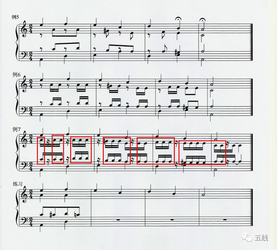 例7,首先将内声部都改为十六分音符,然后,用休止符使得它们以单个,以及两个、三个、四个、五个、六个在一起出现(读者若不理解,可数数红框内某个声部的十六分音符数量),以更增加节拍趣味。