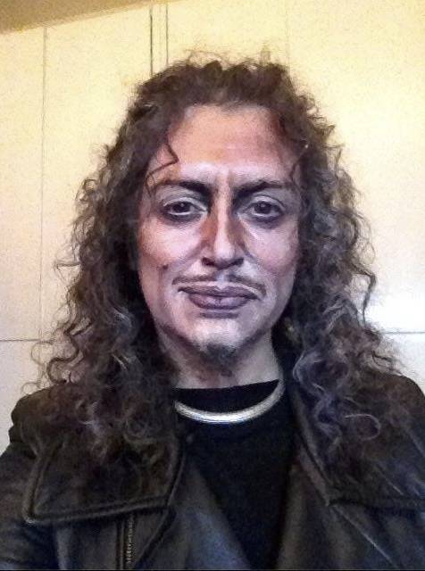 露西亚的“变脸系列”为人们提供了不少变装灵感。但露西亚的作品课不是随随便便就能复制的,当问道画脸的关键时,她答道:我觉得在脸上画画,首先需要具备的是扎实的素描基本功,掌握这个人的脸型,观察怎么去设计,这个草图尤其重要,另外就是表情要配合,尽量去模仿歌手的表情特征,最重要的一点就是眼睛,眼睛是一个人的灵魂,如果眼睛画不好,很可能就无法做到神似,还有多少也要揣摩歌手本人的思想,也就是做到思想和技术相结合吧,(囧,杏仁粒听听就觉得好复杂,还有思想。。。。额。)另外小编补充道只靠在脸上涂涂画画仍然不能解决问题,你还得贴得一手好胡子。比如这一张照片里,这次她成了金属乐队的吉他手柯克-哈姆特,一手好胡子是关键。哈哈(补充:杏仁粒儿魔性的笑声)