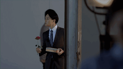 他穿着西装,拿着玫瑰和礼物,等待小男的出现,实在是绅士又浪漫。