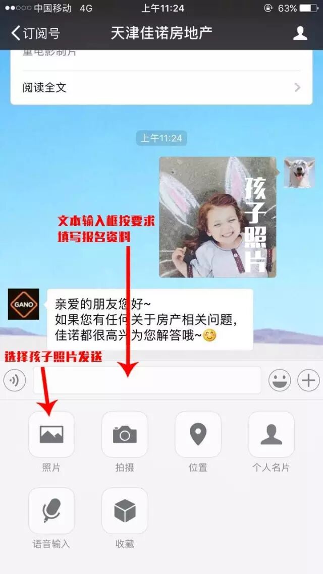 点击聊天输入部分+号,选择照片,即可发送报名参赛的宝宝照片;