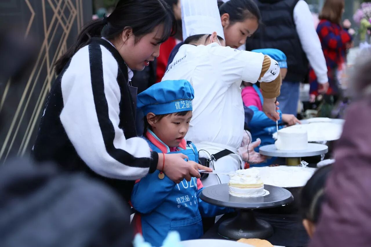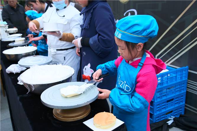 孩子们戴着小帽子,穿上小背心,手持器具,跟大师一起学做蛋糕。看着他们认真的表情,还真的挺像模像样的。