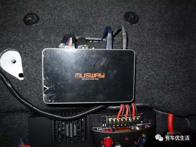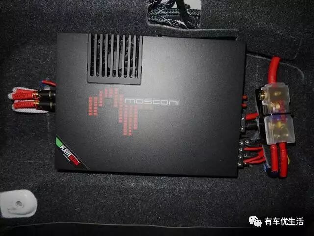 用一台意大利MOSCONI ONE 130.4的四路功放两路推前声场摩雷优特声603,另外两路桥接推来福的10寸低音炮。安装在在座位下不占空间,舞仕刚柔ONE 130.4是一款超越传统电路的AB类功放,每通道额定输出功率130W,高效率的场效应输出功率放大管,即使在长时间持续大功率输出,也能轻松驱动喇叭效果的发挥,保证了无损音质的输出传送。