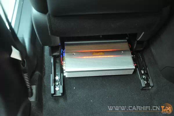这是一台四路的功放,车主为了节省空间,也是为了将来的升级做准备,所以选择将其安放在前车座位的下方!