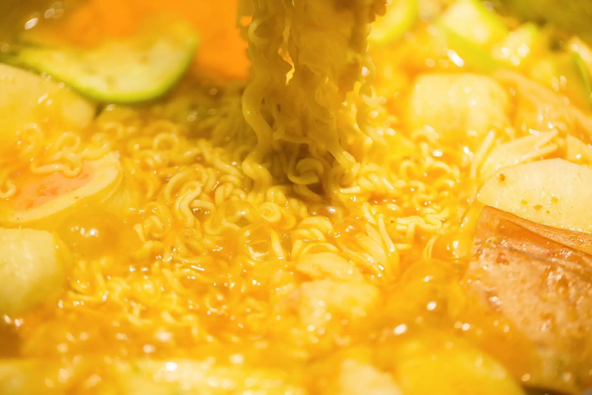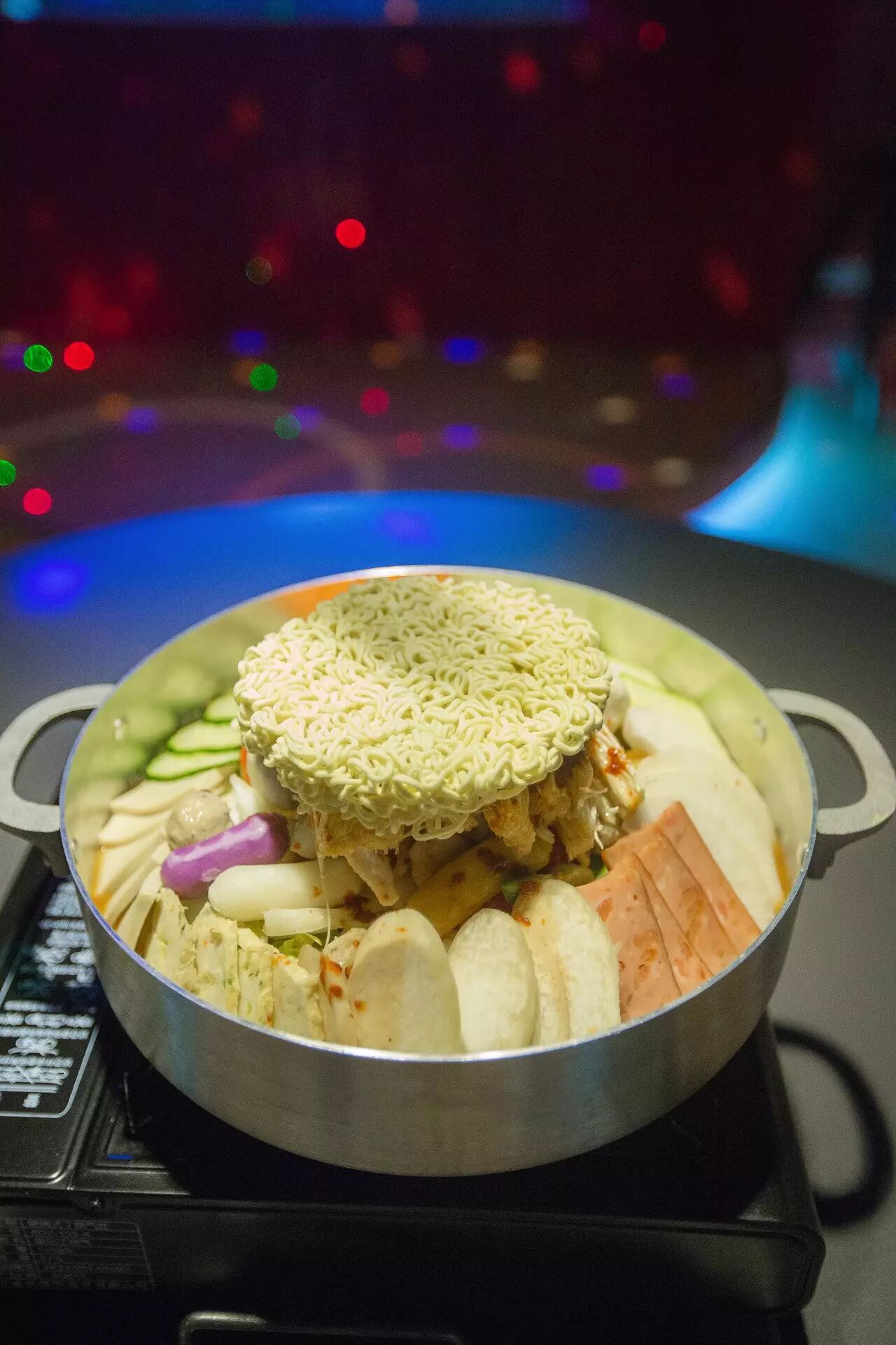 ▲韩国料理怎么能少了最近很火的部队火锅呢! 韩国芝士年糕火锅,汤中夹杂了肉类的香味和泡菜的酸味,吃起来非常爽口。泡面掺杂着芝士,夹起来有很多拉丝!而且锅里的蔬菜配料内容丰富,口感也很多样,在寒冷的冬日,在一勺煮浓的汤,那酸爽,只有吃过才懂。