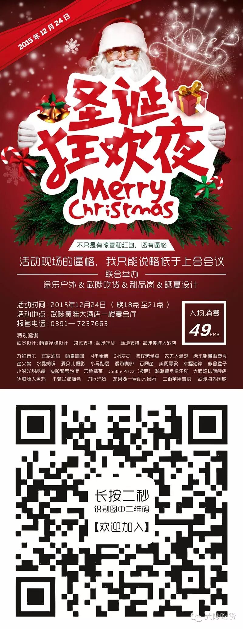 - 参演嘉宾全部来自生活中的你我他,现场为你准备了圣诞老人发礼物、情敌飙歌、千元起刷红包、免费抽大奖,当然少不了的还有来自【武陟吃货】好友们的美食拉。