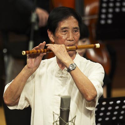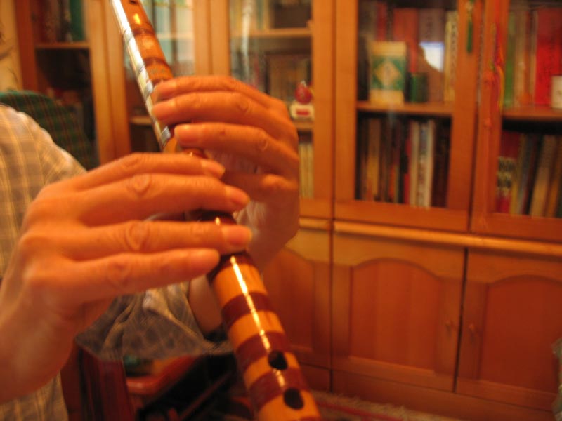 吹笛子时,虽说是坐或立皆可,但一般来讲,在合奏、伴奏之时多采用坐势,而对于独奏演员来说,大多都采取了站立的姿势。因为站起来吹奏不但有利于呼吸与气息通达运用,而且体态灵活,有利于情绪的展示和表达,同时也能给予观众一个理想的形态视觉效果。
