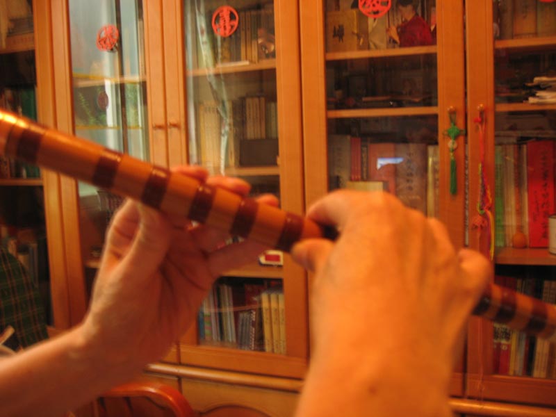 通常来讲,吹笛时的笛尾应朝向人体的右侧,以左手手指按动四、五、六孔;以右手手指按动一、二、三孔;身体也要稍转向右侧,而头面却要向正前方。要挺拔而立(或坐),但要微微含胸不可硬挺胸脯;双脚向右斜方位分成八字形站稳;左右双肘关节支点与其胸肋相距,应为自身一手卡左右为宜。呼吸和吹奏过程中,要全身上下,从足下、丹田(小腹)、膻中(胸部)到头面,要在有控制之下的放松,使气息能轻松而通达运行。这里最重要之点就是身心放松,因为只有放松才能做到灵活自如,应心所欲。
