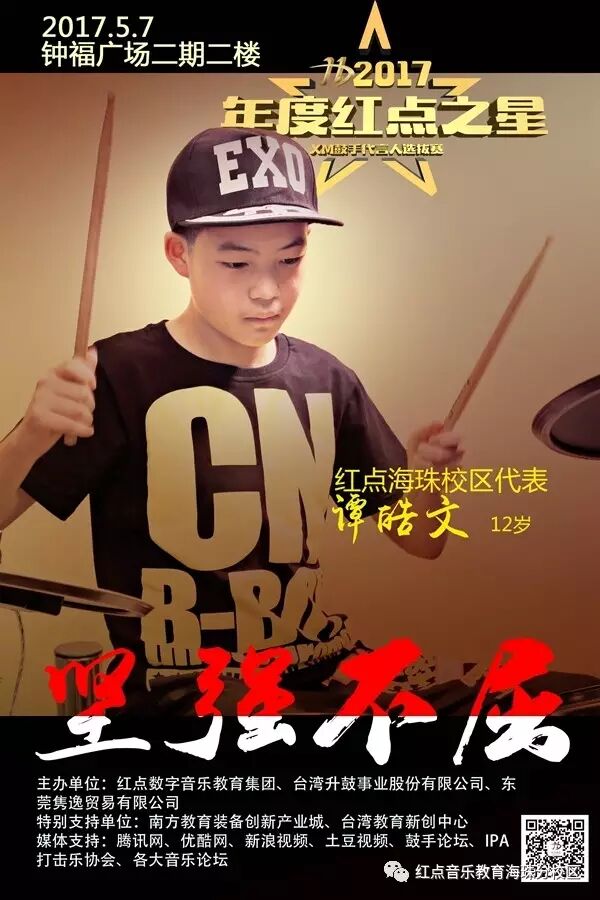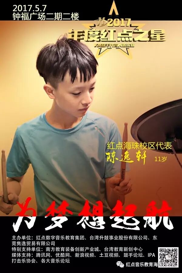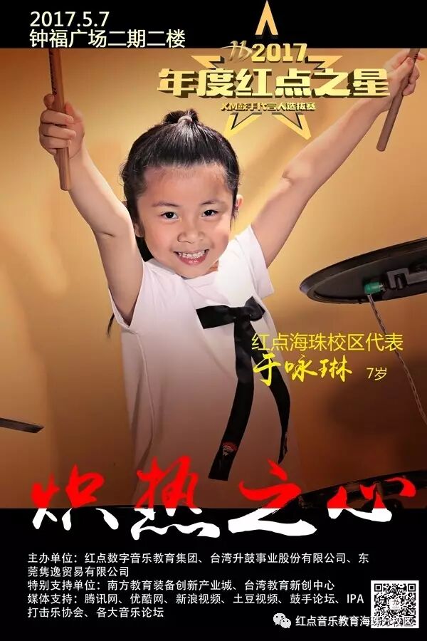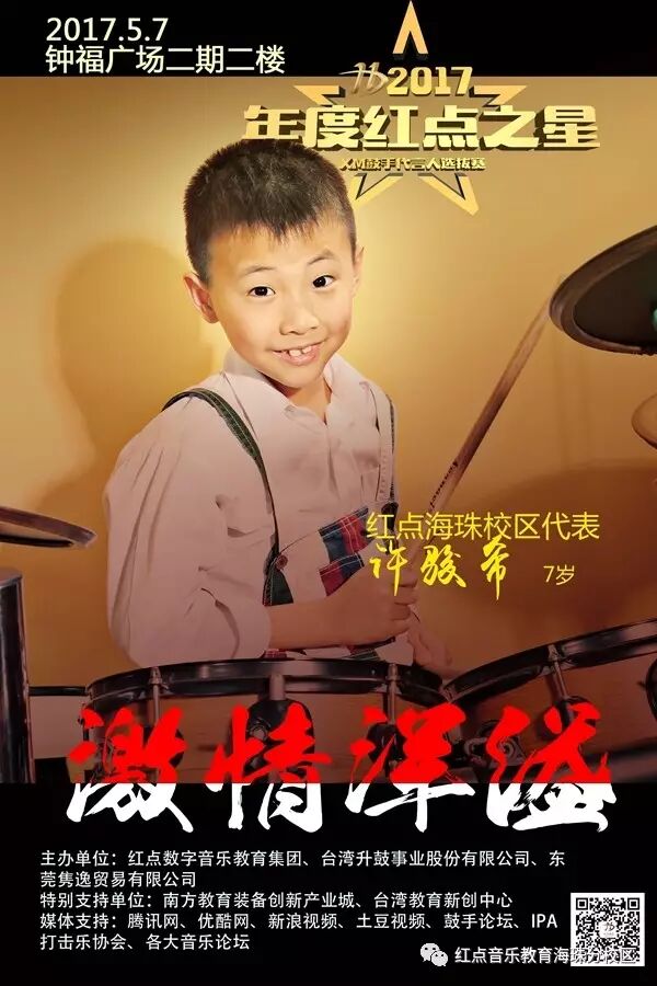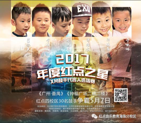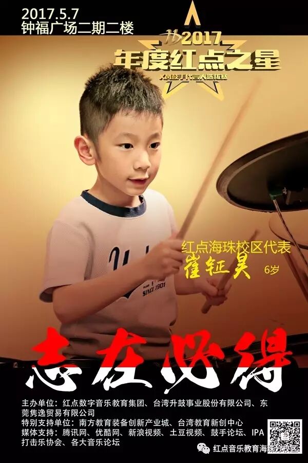 2017年度,红点数字音乐教育——”暨“红点之星”代言人年度总决赛,暨各大校区“小明星”比赛前4名+复活赛的4名适龄打击乐学员,进行为期一天的高规格的打击乐比赛。届时,按照不同年龄划分的各组比赛将真实考验参与者的技巧和临场发挥,并选出最终代言人。